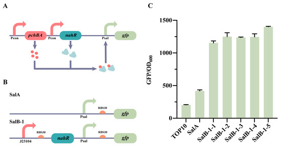 SalB-2 was developed to modify the sensitivity of the Sal system towards salicylic acid by replacing the RBS of SalB-1 with BBa_B0035 (http://parts.igem.org/, accessed on 9 April 2021) [28] and adjusting the expression level of NahR. During the construction and characterization of SalB-2, we discovered that one strain, SalB-3, underwent mutation. Sequencing confirmed that the promoter J23104 of SalB-3 mutated to J23104* (Table S4). Different promoters and RBS sequence combinations (23104-RBS30, J23104-RBS35 and J23104*-RBS30), respectively, control the expression of NahR to form strains SalB-1, SalB-2 and SalB-3 (Figure 3A). The results of the characterization demonstrate that SalB-1, SalB-2, and SalB-3 control the level of NahR expression in the following order, from high to low: J23104-RBS30 > J23104-RBS35 > J23104*-RBS30 (Figure 3B).