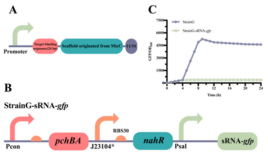 The main plasmids utilized in our study were pSalA and pGFP-100. The pSalA vector was derived from pTra*, which was originally created by Jiang et al. [20]. Primers B-pTra*-R and B-pTra*-F were used to obtain the linear backbone fragment using pTra* as a template, Psal-F and Psal-R to obtain the Psal sequence, and Psal was assembled upstream of gfp using Gibson assembly to obtain the pSalA plasmid. Primers B-pSalA-R and B-pSalA-F were used to obtain the linear backbone fragment using pSalA as a template. Promoter J23100 was included in the primers. Promoter J23100 was assembled upstream of gfp using the Gibson assembly method to obtain the pGFP-100 plasmid. The pchBA and nahR genes were cloned from P. aeruginosa and Pseudomonas putida, respectively, both of which were obtained from the culture collection in the State Key Laboratory of Microbial Technology at Shandong University. As for J23100, J23104 and J23104*, they were included in the upstream primers of genes pchBA and nahR for assembly. Additionally, the pSalC plasmid was based on the pSalA plasmid as a template, using primers B-pSalC-1 and B-pSalC-2 to obtain the fragment containing chloramphenicol and Psal-RBS30. Primers pchBA-F and pchBA-R were used to obtain the pchBA gene fragment, and primers B-pSalC-3 and B-pSalC-4 were to obtain the backbone fragment containing the ColE1 replicon. Primers nahR-F and nahR-R were used to obtain the nahR gene fragment, and the partial promoter J23100 fragment of the pchBA genes was included in primer B-pSalC-3. The partial promoter J23104 fragment of the nahR gene was included in primer B-pSalC-4, and the plasmid pSalC was obtained by Gibson assembly. In order to optimize the experiments, we replaced the wild-type RBS before gfp and nahR with four different RBS options, namely BBa-B0030, BBa-B0034, and BBa-B0035 (available at http://parts.igem.org/Main_Page, accessed on 9 April 2021). These different RBS designs were incorporated into the corresponding DNA fragments using primers and the DpnI digestion method to form pSalB-1, pSalB-2, pSalB-3, and pSalC. Furthermore, the ppc2 gene fragment was synthesized by gene synthesis (Tsingke, Qingdao, China). Primers B-ppc2-R and B-ppc2-F were used to obtain the linear backbone sequence using plasmid pSalC as a template, and primers ppc2-R and ppc2-F were used to obtain the ppc2 fragment. The synthetic sRNA sequence of the ppc2 site was assembled by Gibson to obtain the plasmid pSal1-ppc2. Primers B-ppc3-R and B-ppc2-F were used to obtain the linear backbone sequence using plasmid pSal1-ppc2 as a template. Primers ppc2-R and ppc3-F were used to obtain the synthetic sRNA sequence targeting the ppc3 site. After Gibson assembly, plasmid pSal1-ppc3 was obtained. The ppc2 and ppc3 fragments were assembled into the pSalC construct strains pSal1-ppc2 and pSal1-ppc3 using the Gibson method.
