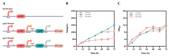 The pSal1 plasmid, which serves as the foundation for salicylic acid production, was created by expressing the pchBA genes on a high-copy plasmid in a constitutive manner (as shown in Figure S1). For assessing the efficacy of different target-binding sequences in suppressing the ppc gene, we selected two such sequences known as ppc2 and ppc3 (as indicated in Table S5). We constructed plasmids pSal1-ppc2 and pSal1-ppc3 to regulate the ppc gene dynamically using the Sal system on plasmid Sal1. The E. coli TOP 10 strain was transformed with these plasmids, resulting in three strains: Sal-Strain1, ppc2-Strain1, and ppc3-Strain1 (as shown in Figure 5A). Subsequently, shake flask fermentation experiments were conducted on these strains, and the findings are presented in Figure 5B,C. Although the growth curves for the three strains were similar, there was a notable disparity in the production of salicylic acid. After 48 h of fermentation, Sal-strain1, ppc2-strain1, and ppc3-strain1 had salicylic acid titers of 47 mg/L, 100 mg/L, and 99 mg/L, respectively, with no significant difference in the titers between Sal-strain1 and ppc3-strain1. After 72 h of fermentation, the salicylic acid titers for Sal-Strain1, ppc2-Strain1, and ppc3-Strain1 were 60 mg/L, 151 mg/L, and 100 mg/L, respectively. The final results demonstrated a 151% increase in salicylic acid titer in ppc2-Strain1 compared to the Sal-Strain1 upon applying the Sal system to down-regulate the ppc gene dynamically, and a 66% increase in the salicylic acid titer in ppc3-Strain1 compared to Sal-Strain1. The discrepancy in salicylic acid production between ppc2-Strain1 and ppc3-Strain1 may be attributed to varying levels of repression in the ppc gene, with ppc3-Strain1 possibly accumulating more PEP to enhance salicylic acid production. These findings validate the effectiveness of the self-induced Sal system and highlight its potential in the field of metabolic engineering.