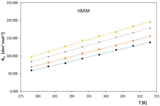 The plots of the association constant, KA [dm3·mol−1], as a function of temperature, T [K], for the investigated ionic liquid, 1-hexyl-3-methylimidazolium chloride [HMIM] with alkoxy alcohols (● 2-methoxyethanol, ● 2-ethoxyethanol, ● 2-propoxyethanol, ● 2-butoxyethanol.