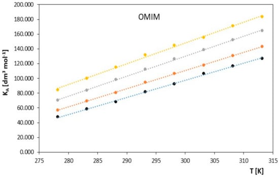 In contrast, the values of the association constant KA for the studied ionic liquids change with temperature, as is evident in Table 1. These values increase with increasing temperature for the studied ionic liquid and with the increasing molar mass of the solvent: METHOXY < ETHOXY < PROPOXY < BUTOXY. However, this trend reverses with increasing molar mass of the ionic liquid. OMIM < HMIM, which is clearly visible in Figure 3 and Figure 4.