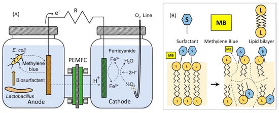 Microbial fuel cell for electricity production and surfactant mechanism on wall cell of bacteria. (A) L. plantarum and E. coli co-culture interaction within an MFC. (B) The interaction of surfactant with cell membrane will facilitate redox mediator (MB) permeation.