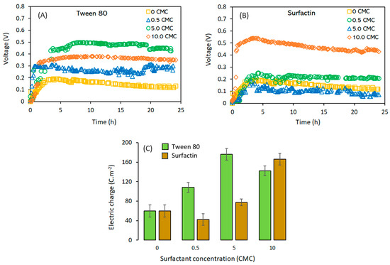 Time domain voltage profiles for MFCs with the addition of selected surfactants, either surfactin or tween 80, are shown in Figure 2. The largest voltage values developed when using tween 80 at 0.5 CMC, 5.0 CMC, and 10 CMC (where CMC denotes the critical micelle concentration) were 0.31 V (1.4 mA m−2), 0.50 V (2.3 mA m−2), and 0.40 V (1.8 mA m−2), respectively, while, for surfactin, the maximal voltage values were 0.18 V (0.8 mA m−2), 0.25 V (1.1 mA m−2), and 0.54 V (2.4 mA m−2) for 0.5 CMC, 5.0 CMC, and 10 CMC, respectively. As shown on Figure 2, after approximately 5.0 h of treatment, the current reached a value that remained almost constant until the end of the fermentation. Figure 2C also provides a graphical comparison among the electric charge densities achieved by using either of the two surfactants. For Tween 80, a significant increase (p < 0.05) in electrical charge was observed for all the evaluated concentrations compared to the E. coli culture without surfactant. However, at 10 CMC, a reduction in cell behavior was observed, possibly due to an inhibition phenomenon generated by the synthetic surfactant. The use of tween 80 increased the electric charge density, reaching its larger value of 176.2 C m−2 at 5 CMC of tween 80; however, any further increase in the concentration of the surfactant will decrease the electric charge density. For example, when the concentration of tween 80 was held at 10 CMC, the charge density decreased to 166.1 C m−2. Tween 80 is an ionic surfactant that has been used to improve the performance of microbial fuel cells. Inhibition of E. coli DH5α growth when using tween 80 was found during the experiments; in addition, when the concentration of tween 80 was increased from 5 CMC to 10 CMC, the cell count decreased from 2.65 × 108 CFU mL−1 to 1.73 × 108 CFU mL−1, respectively.