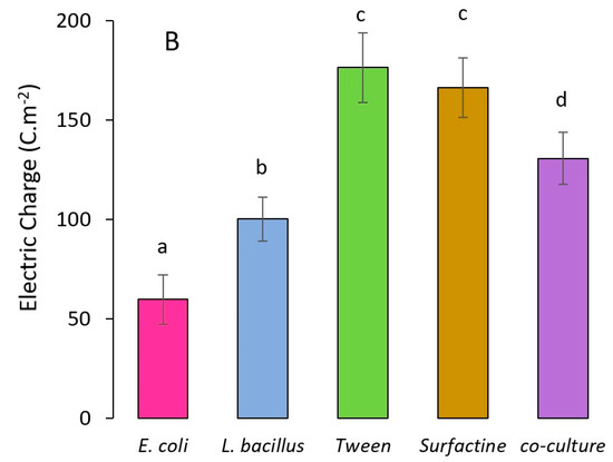 Aiming to evaluate the electric charge density generation, the following conditions were compared, as illustrated in Figure 4: (i) culture of E. coli at 0.3 mM methylene blue (control). (ii) Culture of L. plantarum at 0.3 mM methylene blue. (iii) Culture of E. coli at 0.3 mM methylene blue and 5.0 CMC of Tween 80. (iv) Culture of E. coli at 0.3 mM methylene blue and 10.0 CMC of surfactin. (v) Co-culture of E. coli and L. plantarum at 0.3 mM methylene blue. Lowercase letters show that the means of each result were significantly different from each other (p < 0.05), except between Tween 80 at 5 CMC and surfactin at 10 CMC.