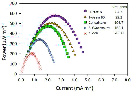As indicated in Figure 5, during MFC operation with E. coli, the maximum power density achieved by the cell was 204.5 μW m−2 with an internal resistance in the order of 288.8 ohms. The addition of surfactin and tween 80 favored the generation of power of almost 282% (577 μW m−2) and 248% (506 μW m−2), respectively, when comparing against the control treatment with E. coli, this was also reflected by a drastic reduction in internal resistance (70% and 65%, respectively). This could be due to a more effective transport of electrons coming from the cell to the anode. On the other hand, the power density generated during the co-culture was in the order of 475 μW m−2, which is almost 2.3 times larger than the one obtained for the control treatment (with an internal resistance in the order of 106.7 ohms). Experiments with a biosurfactant-producing strain of P. aeruginosa compared to a non-producing strain also showed a significant reduction in internal resistance during the operation of a microbial fuel cell [16]. With microorganisms that do not experience significant competition during growth, it would be possible to use co-cultures to extend the operational period of a microbial cell without the need for the addition of exogenous surfactants and increase the obtained power. The presence of exogenous or endogenous surfactants represents an improvement in the electricity production in microbial fuel cells. The use of co-cultures is undoubtedly an alternative that allows for the creation of synergies between the biological capabilities of two microbial species to achieve the goal of enhancing the efficiency of such devices. Improving the efficiency of electricity production and its scalability will allow for wastewater treatment and the generation of useful electrical energy from its organic matter, suitable for domestic use, for example. However, fuel cells should not be limited to just these two applications. Other applications include the degradation of environmental contaminants, hydrogen production, biosensor design, biomolecule production, and CO2 capture, among others [31].