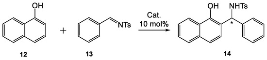 3.4. General Procedure for the Reaction of Ketimine (18) with 6-hydroxyquinoline (17) and Ketimine (18) with 1- and 2-naphthol (12 or 15) in the Presence of Catalyst 1–11
