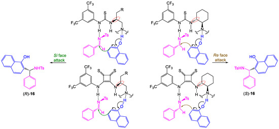 21]. To our knowledge, these are the most important, if not the only, literature reports on the asymmetric Betti reaction. Due to the high demand for the development of this reaction, we decided to test thiourea and, for the first time, thiosquaramide catalysts, compare the obtained results with those already published, and then draw general conclusions regarding the use of organocatalysts of this type in the reactions of α- and β-naphthols and 6-hydroxyquinoline with tosylimine and ketimine. Catalysts of this type have a number of advantages: their synthesis is uncomplicated, and the reactions involving them proceed under mild conditions, without metal cation. Moreover, the presence of a thiourea/thiosquaramide bridge and strongly acidic protons leads to the formation of strong hydrogen bonds and activation of the substrate. While bifunctional chiral thioureas have been widely used in asymmetric synthesis [