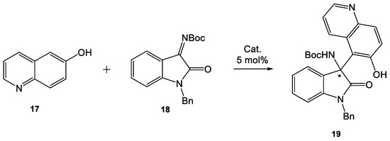 14]. The reaction of naphthols with isatin-derived ketimines turned out to be more demanding. In 2015, Pedro and Khan’s groups, respectively, reported an enantioselective version of this reaction organocatalyzed by the same quinine-derived thiourea to yield chiral 3-amino-2-oxindoles in high yields with excellent enantioselectivity [