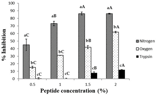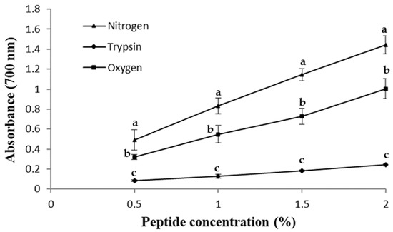 The ABTS•+ scavenging capacity of the hydrolysates at several peptide concentrations is shown in Figure 1. According to these results, the IC50 for the peptides obtained by SWH under a nitrogen stream was 0.5 ± 0.02 mg/mL; for the peptides obtained using enzymatic hydrolysis (trypsin), it was 0.6 ± 0.01 mg/mL; and in the case of the SWH under an oxygen stream, it was 1.1 ± 0.02 mg/mL. Aliaga et al. [24] and Zheng et al. [25] studied the mechanism of the antioxidant activity of various amino acids on the ABTS•+ radical and the effect of pH changes and reaction time, and they found that a hydrogen atom from a thiol, amino or hydroxyl group was necessary during the reaction. In this sense, according to Table 1, the primary structure of the peptides produced by SWH under an oxygen stream showed the lowest amount of histidine, lysine, arginine and tyrosine, which may have resulted in the lower ABTS•+ scavenging activity detected in comparison with those peptides produced by enzymatic hydrolysis and SWH under an inert gas stream (nitrogen).