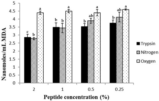 Effect of the hydrolysates on formation of TBARS in beef homogenates. Peptides obtained by trypsin hydrolysis (black columns), SWH under nitrogen stream (hatched columns) and SWH under oxygen stream (dotted columns). Different letters between columns at the same peptide concentration indicate significant difference (p < 0.05).