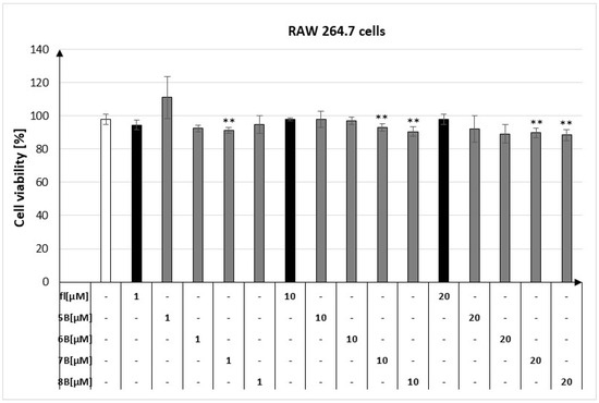 The viability of cell line RAW264.7 in the presence of flavanone (fl), 2′-methylflavanone (5B), 3′-methylflavanone (6B), 4′-methylflavanone (7B), and 6-methylflavanone (8B); ** p < 0.01 compared to control cells.