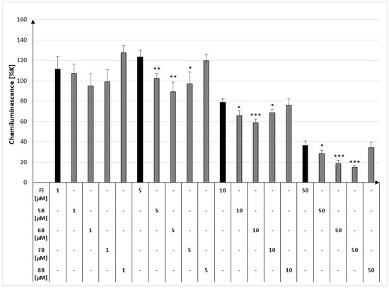 The study results indicated that compounds 5B and 6B significantly inhibited chemiluminescence in RAW264.7 macrophages stimulated via PMA. Additionally, compound 7B showed inhibition at the highest concentration used. However, compound 8B did not inhibit any inhibitory effect on chemiluminescence at any of the concentrations tested (Figure 3).