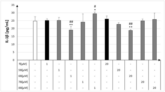 Concentrations of IL-1β in culture supernatants of cell lines RAW264.7 in the presence of flavanone (fl), 2′-methylflavanone (5B), 3′-methylflavanone (6B), 4′-methylflavanone (7B), and 6-methylflavanone (8B); # p < 0.05 and ## p < 0.01 compared to flavanone; * p < 0.05 and ** p < 0.01 compared to control (control cells and compounds incubation with LPS).
