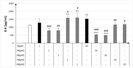 Concentrations of IL-6 in culture supernatants of macrophages in the presence of flavanone (fl), 2′-methylflavanone (5B), 3′-methylflavanone (6B), 4′-methylflavanone (7B), and 6-methylflavanone (8B); control are cells treated with LPS; # p < 0.05, ## p < 0.01, ### p < 0.001 compared to flavanone; * p < 0.05, ** p < 0.01 and *** p < 0.001 compared to control (control cells and compounds incubation with LPS).