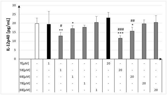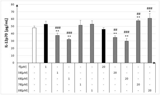 In our experiment, the production of IL-12p40 by RAW264.7 cells significantly decreased in the presence of compounds 5B and 6B at the highest concentrations used. The concentration of IL-12p40 was 11.56 ± 1.42 pg/mL for compound 5B and 15.52 ± 2.22 pg/mL for compound 6B (Figure 6).