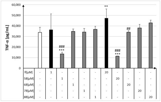 Concentrations of TNF-α in culture supernatants of macrophages in the presence of flavanone (fl), 2′-methylflavanone (5B), 3′-methylflavanone (6B), 4′-methylflavanone (7B), and 6-methylflavanone (8B); control are cells treated with LPS; ## p < 0.01 and ### p < 0.001 compared to flavanone; ** p < 0.01 and *** p < 0.001 compared to control (control cells and compound incubations with LPS).