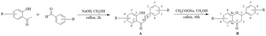 Synthesis of flavonoid compounds (chalcones 5A–8A and flavanones 5B–8B).