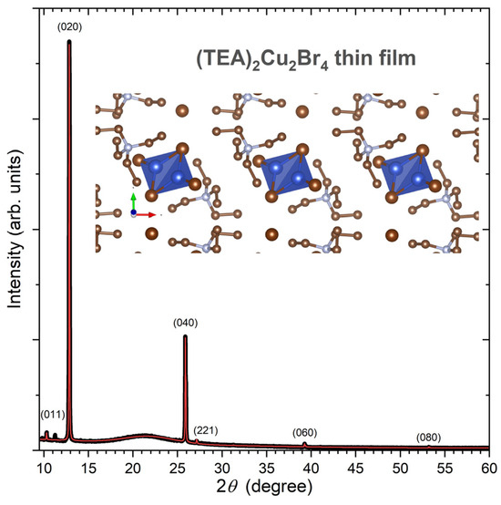 Figure 1 shows the experimental X-ray diffraction (XRD) pattern of a (TEA)2Cu2Br4 thin film on quartz (black line). The XRD pattern was analyzed by a Rietveld refinement procedure employing the program MAUD [28], using the structure reported by Chen et al. (monoclinic space group P 21/c, no. 14) as a starting point [25]. Interestingly, the XRD pattern exhibits a strong texture; therefore, (0k0) peaks (k = 2, 4, 6, and 8) are dominant. Other reflections, such as (011) and (221), are barely visible. From the fit (red line), we obtained the unit cell parameters a = 8.46(5) Å, b = 13.7606(4) Å, c = 11.08(2) Å, and β = 98.3(7)°. These can be, for instance, compared with the values of Chen et al., who found a = 8.3505(8) Å, b = 13.7641(13) Å, c = 11.0507(11) Å, and β = 97.076(9)°, based on their single-crystal data [25]. As expected, because of the strong texture effects of the film, only b is well defined in our case, and the scatter in the other parameters is expected, because of the limited number of diffraction peaks available. In any case, our XRD pattern confirms the successful synthesis of the (TEA)2Cu2Br4 thin film. A zoom-in into the “molecular salt” structure of this compound featuring isolated [Cu2Br4]2− anions is provided on the top right of Figure 1. It was obtained using the program VESTA 3 [29]. These anions are discrete centrosymmetric dimers, and the configuration of the bromide ligands around copper(I) is distorted trigonal planar [23].