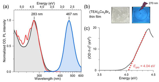 (a) Normalized steady-state absorption (black), PL excitation (red, λem = 460 nm), and PL spectra (blue, λexc = 310 nm of a (TEA)2Cu2Br4 thin film on quartz at 296 K. (b) Photos of the colorless thin film (left) and the blue emission of the film upon photoexcitation with continuous-wave light from a UV–LED with a peak wavelength of 270 nm (right). (c) Tauc plot of the PL excitation spectrum assuming a direct band gap of the material.