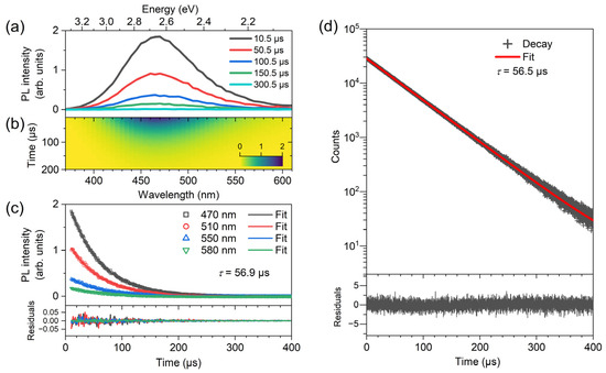 Steady-state and transient PL measurements of the thin-film samples were performed at 296 K using a spectrophotometer (Agilent, Santa Clara, CA, USA, Cary Eclipse) with the excitation and emission slit widths set at 5 nm. Transient PL decays were recorded over the wavelength range 370–610 nm at a step size of 5 nm after exciting the films at 310 nm using a pulsed xenon lamp (80 Hz, FWHM 2 μs) in combination with a monochromator. To avoid any contamination of the kinetics by contributions of the lamp pulse, the kinetics were collected starting from a delay time of 10 μs. They were recorded up to 1.0 ms, with a gate time of 2 μs and a time resolution of 1 μs. Ten individual kinetics were averaged for each wavelength. The transient spectra were obtained by transposing the set of wavelength-dependent kinetics. Finally, these PL spectra were post-processed by applying a calibration curve, which corrected for the wavelength-dependent sensitivity of the emission monochromator and photomultiplier detector.