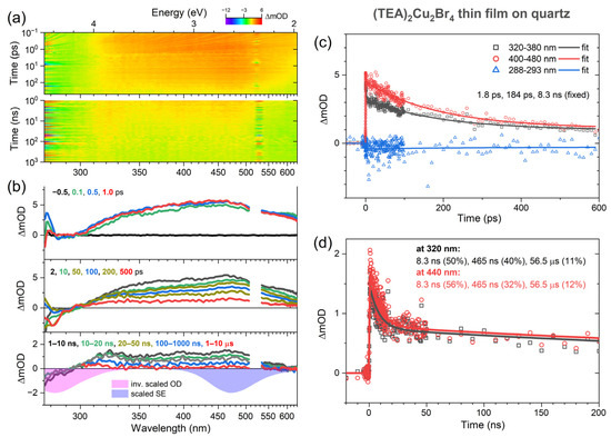Ultrafast broadband transient absorption experiments with up to 1.5 ns delay time were carried out on a setup based on a regeneratively amplified titanium:sapphire system (Coherent, Santa Clara, CA, USA, Libra USP-HE) with a center wavelength of 800 nm and a repetition frequency of 920 Hz. It covers the UV–Vis region (260–700 nm) [34] with a time resolution of about 80 fs and is based on the pump−supercontinuum probe (PSCP) technique [35]. The samples were excited at 460 Hz using the 260 nm output of an OPA system (Coherent, OPerA Solo). In order to access long delay times up to several hundred microseconds, the UV–Vis setup was combined with a Q-switched Nd:YAG microlaser (Standa, Vilnius, Lithuania, Standa-Q1TH), which was externally triggered at 460 Hz and synchronized with the electronics of the ultrafast regenerative amplifier system (jitter less than 350 ps) [22]. The second-harmonic output of the laser was frequency-doubled by an external BBO crystal, and the resulting 266 nm pulses (FWHM ca. 420 ps) were employed for exciting the halocuprate(I) thin film. The film sample (T = 296 K) had an optical density of about 0.16 at the excitation wavelength. It was mounted inside a nitrogen-flushed aluminum cell and translated by a piezo stage in the x–y plane within a sample area of 2 × 2 mm2. The initial carrier number density was about 5 × 1018 cm−3. The kinetics of the charge carrier relaxation was described by a sum of three exponential functions.