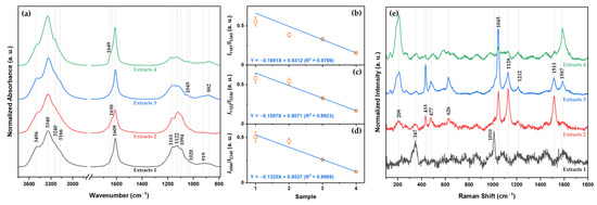 The IR spectra of minerals extracted from each desalination step are displayed in Figure 3a. There are characteristic bands of hydrated minerals associated with SO42−. In the first extracts, 12 bands appear: the four bands at 3496, 3340, 3240, and 3166 cm−1 are the O-H stretching vibration mode; the band at 1609 cm−1 and the shoulder at 1630 cm−1 are assigned to the H2O bending mode; and the five bands at 1161, 1122, 1094, 1045, 1020, and 919 cm−1 are assigned to SO42− [45,46]. Based on the EDS analysis, XRD patterns, and some references [45,46], it is observed that the IR spectra correspond to MgSO4(H2O)x. There are no IR bands corresponding to NaCl and MgCl2(H2O)x [47,48]. When seawater undergoes desalination, all band shapes change. These changes correlate with changes in the degree of hydration of MgSO4(H2O)x. Figure 3b–d shows the relative intensities of the bands at 1161, 1122, and 1094 cm−1 relative to the band at 3340 cm−1 along the extract of each desalination step. The calibration curves are obtained using linear fitting (Y = A + BX equation) with parameters at a 95% confidence level. As shown in Figure 3b–d, the relative intensities of the mineral bands related to SO42− are linearly related for different extracts: for I1161/3340, Y = −0.1691X + 0.8312 (R2 = 0.9789); for I1122/3340, Y = −0.1597X + 0.8071 (R2 = 0.9923); and for I1094/3340, Y = −0.1325X + 0.6537 (R2 = 0.9998). This observation indicates that the quantitative analysis of the degree of hydration of MgSO4(H2O)x in each extract is possible using IR spectra.