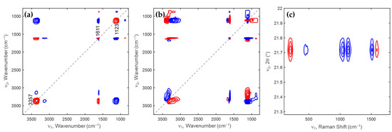 (a) Synchronous and (b) asynchronous 2D IR correlation spectra. (c) Synchronous 2D heterospectral XRD-Raman correlation spectra for the XRD pattern at 21.5–21.9° diffraction angles and Raman spectra in 100–1800 cm−1 spectral region. Positive and negative cross peaks, respectively, are red and blue lines.