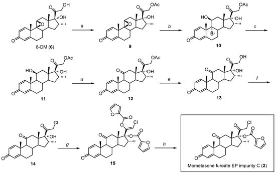 The synthesis of the target product 2 started from the cheap and readily available 9β,11β-epoxy-17α,21-dihydroxy-16α-methyl-3,20-dioxo-pregna-1,4-diene (6), namely 8-DM (Scheme 2) [22]. Being 2 a process impurity structurally related to the parent API, we adopted a strategy similar to the synthetic sequence for the manufacturing of MF (1) shown in Scheme 1B. The synthesis consisted of the initial manipulation of ring C by converting the 11,12-epoxide moiety to the desired C11-oxo functionality, followed by the chlorination at C21-position and the final acylation reaction at the C17-position (Scheme 2). Initially, the route was attempted at mg scale. Thus, 8-DM (6) was treated with acetic anhydride and potassium acetate in N,N-dimethylacetamide (DMAC) at 25 °C affording the corresponding 21-acetoxy intermediate 9 (step a). The crude 9 obtained by aqueous extractive work-up (95% recovery) was then submitted to the epoxide ring-opening by treatment with hydrobromic acid in AcOH at 25 °C. After aqueous extractive work-up, the desired bromohydrin derivative 10 was isolated in 90% yield and good purity (step b). The crude bromohydrin 10 was then de-halogenated under Barton’s conditions [23,24] by treatment with CrCl3·6H2O, zinc dust and thioglycolic acid in DMF and DMSO affording the desired 11β-hydroxy intermediate 11 in 82% isolated yield from 6 after chromatographic purification (step c). Oxidation of 11 by treatment with pyridinium chlorochromate (PCC) in CH2Cl2 afforded the corresponding 11-oxo derivative 12 in 74% yield after chromatographic purification (step d). Deprotection of the acetyl group at C21-position was achieved under mild alkaline conditions with 95% crude recovery after aqueous extractive work-up (step e). The C21 free hydroxyl group was activated by treatment with methanesulfonyl chloride (MsCl) and 4-dimethylaminopyridine (DMAP) in CH2Cl2 at 0 °C. The methanesulfonate intermediate thus obtained was converted into the corresponding 21-chloro derivative 14 by heating the crude mixture (Scheme 2, step f). The crude 14 was finally submitted to the furoylation reaction at the C-17 tertiary alcohol group (step g).