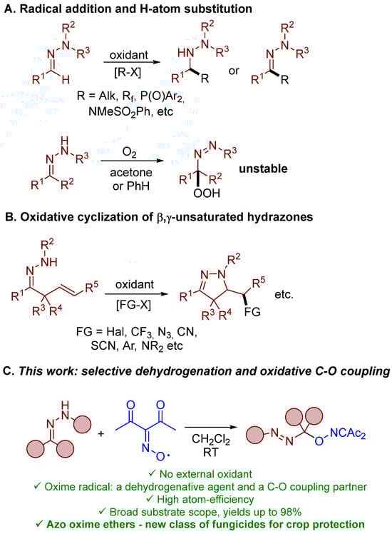 The functionalization of organic compounds employing free radicals has emerged as a powerful tool in modern organic chemistry [1,2]. In particular, N-oxyl radicals [3] have gained much attention as key agents in oxidative functionalization due to their mild conditions of generation, relatively high stability combined with high reactivity towards organic substrates, and outstanding structural diversity, allowing for control of their properties. However, N-oxyl radicals are usually generated in situ from corresponding N-hydroxy compounds and thus their usage demands oxidants or catalysts and other additives. Frequently, these additional reagents contain transition-metal salts, pose limitations on the substrate scope, and do not correspond to the principles of green chemistry. The peculiar feature of the present work is the use of diacetyliminoxyl [4] as a single ready-to-use free-radical reagent which plays the role of both oxidant and coupling partner for the oxidative functionalization reaction of hydrazones (Scheme 1C). Previously, free-radical chemistry of hydrazones was associated mainly with addition and hydrogen substitution reactions of aldehyde hydrazones [5,6,7] (Scheme 1A) and cyclizations of hydrazone-derived N-radicals [7,8,9] (Scheme 1B). However, ionic mechanisms were proposed for oxidative cyclizations of α,β-unsaturated N-tosylhydrazones in some cases [8,10]. It should also be noted that in some functionalizations of type A (Scheme 1A), an additional synthetic step of chelate complex formation was necessary for effective radical functionalization of hydrazones [11,12,13]. Hydrazones are reported to undergo peroxidation by t-BuOOH in the presence of cobalt–salen complexes with the formation of geminal azoperoxides and geminal azoxyperoxides [14]. Unstable geminal azohydroperoxides [15] are formed as a result of hydrazone autoxidation by molecular oxygen [16,17,18,19]. In general, free-radical functionalization of hydrazones with the formation of azocompounds is less developed compared to methods based on electrophilic attack of hydrazone carbon atoms, such as Michael-type reactions [20,21,22,23], chlorination [24], alkoxylation, or cyanation [25]. Geminal azoacetates are synthesized by the oxidation of hydrazones with Pb(OAc)4 [26,27,28]. In the present work (Scheme 1C), diacetyliminoxyl was used as the only necessary reagent for high-yielding oxidative C–O coupling with the broad scope of both ketohydrazones and aldehyde-derived hydrazones at room temperature. It should be noted that none of the products of oxidative functionalization of hydrazones mentioned above were considered as fungicidal compounds. Unexpectedly, synthesized C–O coupling products were discovered as a new structural family of fungicides with activity against phytopathogenic fungi at the level of commercially used crop-protection compounds. This finding is very important in the light of the continuous development of strains of phytopathogenic fungi which are resistant against known synthetic fungicide types [29,30,31].