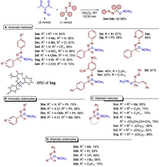 Hydrazone 2 (1 mmol, 134–460 mg) was added to a stirred solution of diacetyliminoxyl 1 (2 mmol) in CH2Cl2 (50 mL) at room temperature. The reaction mixture was stirred at RT for 15–30 min until the red color of diacetyliminoxyl disappeared. After that, the reaction mixture was rotary evaporated under a water-jet vacuum. C–O coupling products 3 were isolated by column chromatography on silica gel.