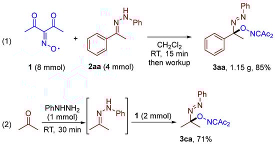 Scheme 3 demonstrates the practical applicability of the developed protocol for the synthesis at a 4 mmol scale without chromatographic purification or recrystallization (Scheme 3, (1)). Due to the instability of some phenylhydrazones in their pure form, we developed a one-pot procedure delivering the in situ generation of hydrazone that was sequentially added to the solution of diacetyliminoxyl (Scheme 3, (2)). Employing this protocol, the corresponding C–O coupling product 3ca was obtained at a yield of 71%.