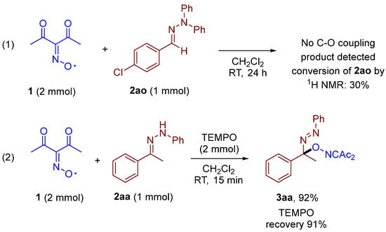 Control experiments were conducted to support the plausible reaction mechanism (Scheme 4). N,N-diphenyl phenylhydrazone 2ao was introduced in the reaction with diacetyliminoxyl at standard reaction conditions (Scheme 4, (1)). There was no C–O coupling product observed by 1H-NMR monitoring of the crude reaction mixture after 24 h, indicating that hydrogen atom abstraction from the nitrogen atom is a possible crucial step rather than the addition of an oxime radical at the C=N double bond. The experiment with TEMPO (Scheme 4, (2)) is a typical control reaction which is usually employed to intercept possible C-centered radical intermediates. The introduction of two equivalents of TEMPO into the reaction of diacetyliminoxyl 1 with hydrazone 2aa did not lead to significant changes; product 3aa was obtained without yield loss (Scheme 4, (2)). Moreover, no formation of a TEMPO adduct with C-centered radical was observed (TEMPO recovery 91%), highlighting the exceptionally high efficiency of diacetyliminoxyl in scavenging stabilized C-centered radicals [33].
