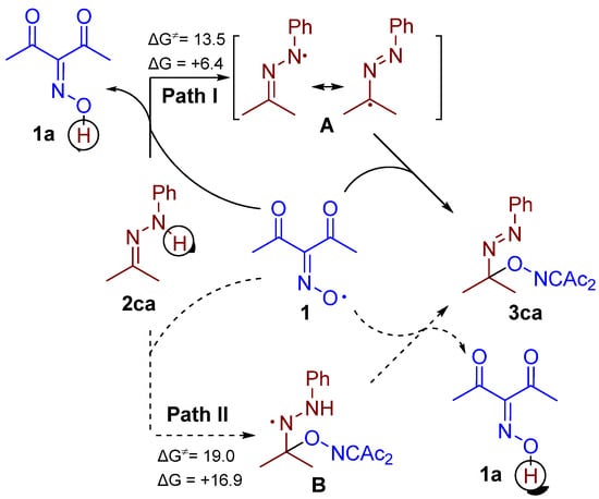 Two possible reaction pathways can be proposed for the discovered C–O coupling of diacetyliminoxyl with hydrazones (Scheme 5). In path I, the hydrogen atom abstraction from hydrazone 2ca by diacetyliminoxyl 1 is followed by the coupling of the resultant hydrazyl radical A with 1. In path II, diacetyliminoxyl is added to hydrazone 2ca first, then hydrogen atom from adduct B is abstracted. In both cases, the first stage is expected to be rate determining, whereas the second is expected to be very fast or even barrierless. In order to evaluate which path is more plausible, DFT calculations were performed by employing the low-cost but robust B97-3c composite method [35]. The calculations revealed that path I is favored, both kinetically and thermodynamically, compared to path II; however, both pathways demonstrate activation barriers less than 20 kcal·mol−1, which are acceptable for room temperature reactions. The fact that path I is energetically more favored than path II is in agreement with the published data on C–O coupling of diacetyliminoxyl with pyrazolones, isoxazolones, and phenols [33]. However, it should be noted that diacetyliminoxyl addition reactions to π-systems were reported recently [34].