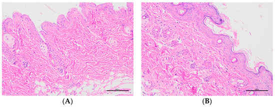 The first step was to clip the fur on the backs of the mice. Next, a cotton ball was dipped into depilatory cream and applied as a thin layer to the desired area. After 2–3 min, the cream was washed off with lukewarm water and the area was dried with gauze; then, the mice were killed 12 h after hair removal. A blunt dissection was performed to remove the full thickness of the dorsal skin, and the skin was stored at −20 °C.