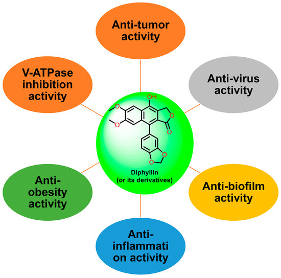 Natural products are renewable sources for drug discovery. The structural diversity of natural products and their easy combination with biological macromolecules determine their participation in life control. They have incomparable advantages in the life regulation process, and they also occupy an irreplaceable position in the research and development of new drugs. From the discovery of traditional Chinese medicine to modern antibiotics, natural products have played a significant role. In modern drug development, natural products and their derivatives are always important sources of candidate drugs and lead compounds. According to statistics, nearly two-thirds of all drugs on the market from 1981 to 2019 were related to natural products [1]. An abundance of oxygen atoms in their complex structures endows them with advanced binding properties with drug targets [2]. Diphyllin (1) is an arylnaphthalene lignan lactone that can be isolated from many traditional medicinal plants [3,4]. There are seven oxygens in its structure (Figure 1), the molecular weight of which is 380.35. We conducted ADME predictions using free online services [5] (http://www.swissadme.ch/index.php, accessed on 1 November 2023). The results found that it had a high topological polar surface area (TPSA) value of 83.45, which indicated strong membrane permeability. The cLogP value (3.23) was also moderate, following the Lipinski’s Rule of Five. It was predicted to have high gastrointestinal absorption. However, the blood–brain barrier (BBB) permeant was low, implying that it can only arrive at the brain tissue with difficulty. Disappointingly, it was also predicted with liver microsomal enzymes inhibitory activity, which means that drug interactions with other enzymes occur easily. It is characterized by muti-bioactivities such as anti-virus, anti-tumor, anti-inflammatory, and antioxidant activities. However, some drawbacks, such as its relatively weak potency, low aqueous solubility, and poor metabolic stability, restrict its developmental prospects. Therefore, numerous studies have been conducted across the world in the pursuit of more appropriate active derivatives. The bioactivities of diphyllin (1) or its derivatives are outlined in Figure 2 and are detailed point by point below.
