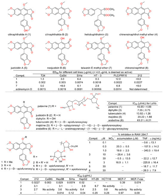 Cancer is the second leading cause of human death around the world [6,7]. Therefore, discovering anticancer agents to reverse this situation is imperative [8]. Early in 1999, Shiowhwa Day et al. published a paper in the Journal of Natural Products. They stated that the diphyllin analogues 1, 5, and 7 were cytotoxic against several cancer cell lines (e.g., T24 (bladder cancer cells), CaSKi (cervical cancer intestinal metastatic cells), SiHa (cervical squamous cells), HT-3 (cervical cancer cells), PLC/PRF/5 (liver cancer Alexander cells), and 212 (brain neuroblastoma cells)) (Figure 3), among which compound 5 was prominent (IC50 values were several pico per milliliter). The diphyllin analogues 2, 4, 6, and 8 were not active for cancer cell lines [9]. In 2002, Gabbriella Innocenti et al. isolated six compounds from shoot cultures of Haplophyllum patavinum, and they found that diphyllin (compound 3) displayed the best anti-human colon carcinoma (LoVo cell line) activity with an IC50 value of 7.55 μL/mL [10]. In the same year, Shiow-Hwa Day and co-workers delineated a novel 4-O-α-L-arabinopyranosyl-(1‴→2″)-β-D-apiofuranosyldiphyllin (2), also named procumbenoside A, as well as eleven already-reported compounds. Their bioactive evaluation assays found that justicidin A (5), diphyllin (3), and tuberculatin (4) showed obvious cytotoxic effects. In addition, compounds 1 and 4 increased tumor-necrosis factor-α (TNF-α) production in RAW 264.7 cells treated with lipopolysaccharide (LPS) at low concentrations [11]. However, the selectivity of these compounds toward non-tumor cells was not described.