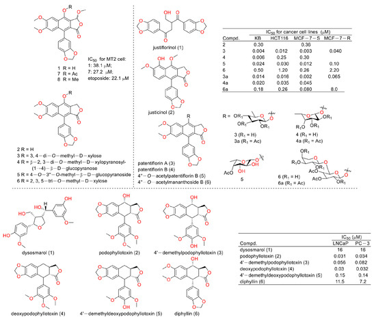 In 2003, Chimmani Ramesh et al. found that arylnaphthalide lignans from Cleistanthus collinus displayed cytotoxicity against the MT2 cell line (a kind of T lymphocytic leukemia). The IC50 values of cleistanone (1) and its acetyl derivative 7 (as showed in Figure 4) were 38.1 μM and 27.2 μM for MT2 cells, which was almost the same as the positive control etoposide (the IC50 value was 22.1 μM) [12]. In 2005, Sophie Susplugas et al. obtained one new norlignan (1) and five new lignans (2–6) from the leaves and stems of Justicia patentiflora. They found that lignans 2–6 displayed obvious cytotoxicity toward four cancer cell lines with IC50 values at nanomoles. They also led to G0/G1 phase blockades within cancer cells [13]. In 2007, Ren-Wang Jiang et al. reported lignans from Dysosma wersipellis, which showed anti-prostate cancer (LNCaP and PC-3 cells) activity with IC50 values ranging from 0.031 µM to 0.15 µM for compounds 2–5 [14].