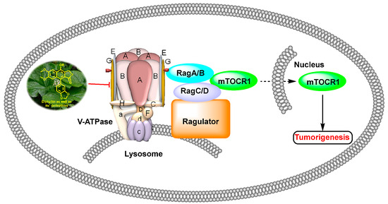 Diphyllin as well as its derivatives show anti-tumor activity via vacuolar H+-ATPase inhibition pathway. mTORC: mammalian target of rapamycin.