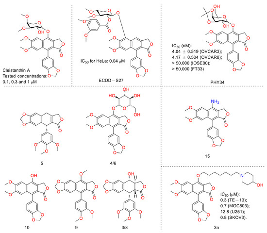 In 2019, Jiraporn Paha et al. reported that the diphyllin glycoside derivative (named ECDD-S27) (Figure 13) induced autophagy by targeting vacuolar ATPase, increased levels of p62 and LC3-II, and ultimately led to cancer cell survival inhibition (IC50 ranged from 0.016 µM to 0.080 µM). ECDD-S27 increased the number of autophagic vacuoles by restraining autophagic flux and inhibiting V-ATPase activity and consequently decreased colorectal adenocarcinoma HT-29 cell viability at concentrations ranging from 0.016 μM to 0.4 μM. It is also nontoxic to human kidney normal HK-2 cells with an IC50 value higher than 50 μM [40]. In 2021, Huixia Feng et al. demonstrated the anti-tumor activity of diphyllin. It possessed IC50 values of 6.46 ± 1.79 μM and 30.73 ± 0.56 μM on A549 and HT-29 cells, respectively. It also showed good COX-2 inhibitory activity, with an IC50 value of 1.29 ± 0.14 μM. Furthermore, other bioactive components (diphyllin derivatives for example) (Figure 13) from Podophyllum sinense were also identified by researchers using multi-target ultrafiltration [41]. One year later, Yang Li et al. designed and synthesized novel nitrogen-containing derivatives of diphyllin as anti-tumor agents. They screened out a lead 15 whose IC50 values toward pancreatic cancer CFPAC-1 cells were 3 nM (69-fold more potent than that of diphyllin). It showed selectivity toward normal hepatocyte L02 cells with a selective index of 162. In addition, it possessed better drug-like properties (e.g., improved aqueous solubility and metabolic stability in liver microsomes). The mechanistic studies revealed that the lead induced a G0/G1 phase blockade and decreases in CDK4 and cyclin D1 in a concentration-dependent manner. It restricted the later stage of autophagy in CFPAC-1 cells, too. Furthermore, it (10 mg/kg) displayed obvious anti-PANC02 (mouse pancreatic cancer) in vivo without obvious toxicity to the mice [42].