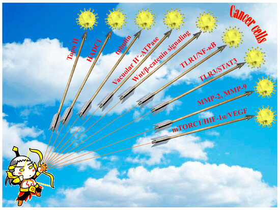The main regulatory pathways or targets of the anti-tumor activity of diphyllin and its derivatives. The inspiration for the creation of this figure is a combination of Chinese mythology, namely, Houyi shooting the suns.