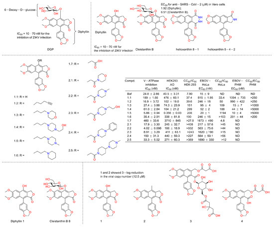 Numerous studies have suggested that ZIKV infection was obviously affected by the inhibition of endosomal acidification [55,56,57]. Inspired by the fact that diphyllin exhibited vacuolar H+-ATPase inhibition, Alicia Martinez-Lopez et al. evaluated the anti-ZIKV infection activity of 6-deoxyglucose-diphyllin (DGP) (Figure 16). They found that diphyllin (1) exhibited anti-ZIKV activity, both in vitro and in vivo (1 mg/kg), by preventing the acidification of endosomal/lysosomal compartments in different monkey and human cell lines without triggering cellular toxicity and then by inhibiting ZIKV fusion with cellular membranes and infections (IC50 = 10–70 nM for the inhibition of ZIKV infection) in 2019. It also displayed broad spectrum antiviral activity against other flaviviruses [58]. Last year, Michal Stefanik et al. designed assays to investigate the anti-SARS-CoV-2 activity of diphyllin (1) and diphyllinoside cleistanthin B and two structurally related compounds, helioxanthin 8-1 and helioxanthin 5-4-2. Their results showed that only diphyllin (1) and diphyllinoside cleistanthin B displayed anti-SARS-CoV-2 activity with EC50 values of 1.92 and 6.51 µM in Vero cells without cytotoxicity at concentrations of up to 100 μM [59]. In 2022, Caroline B. Plescia et al. performed a synthesis and bio-evaluation of phenol-substituted diphyllin derivatives. Their results showed that these derivatives inhibited viral entry that was dependent upon structural variations at nanomolar concentrations in cells challenged with the Ebola virus. The mechanism research revealed that they modulated the endosomal pH. These results were consistent with the fact that diphyllin is a selective pH-dependent viral entry block in late endosomes [60]. In 2022, Michal Štefánik et al. reported that diphyllin and diphyllinosides (Cleistanthin B 8) displayed broad-spectrum antiviral activities against multiple enveloped RNA and DNA viruses by blocking the replication of these viruses. Diphyllin showed antiviral activity against tick-borne encephalitis virus, West Nile virus, Zika virus, Rift Valley fever virus, rabies virus, and herpes-simplex virus type 1 at sub-micromolar or low-micromolar concentrations. It was not cytotoxic for Vero and BHK-21 cells up to 100 µM [4]. This year, Gergö Tóth et al. evaluated the antiviral and cytotoxic potency of two known arylnaphthalene lignans (diphyllin and justicidin B (2)) and two novel arylnaphthalene lignans (linadiacin A (3) and linadiacin B (4)) in SARS-CoV-2-infected cells and various cancer cell lines in vitro. They found that both of them showed anti-SARS-CoV-2 activities with a 3-log reduction in the viral copy number at a 12.5 μM concentration. Some of them displayed obvious cytotoxicity against cancer cell lines at several micromoles (2.4 μM and 2.6 μM against A2058 for 3 and 4, respectively, and 2.55 μM against MM6 for 2) [61]. The biological test assays and anti-virus mechanisms of diphyllin as well as its derivatives are summarized in Table 2.