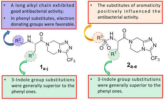 The structure–activity relationship of triazolo[4,3-a]pyrazine derivatives was preliminarily analyzed and the results were summarized in Figure 2. In general, [1,2,4]triazolo[4,3-a]pyrazine nucleus bearing a ethylenediamine moiety were prone to the antibacterial activities. It may be because that at physiological pH conditions, protonated amines or nitrogen heterocycles could form π-cation interactions with the amino acid carbonyl groups of DNA gyrase [29], which was beneficial for antibacterial effects. Compounds with R1 as a 3-indole group were generally more active than phenyl-substituted ones. Liu et al. demonstrated that indole derivatives exhibit moderate to good antibacterial effects, but N-methylation of the indole moiety was not necessary for a compound to have good antibacterial activity [30]. From these results, it could be reasonably inferred that triazolo[4,3-a]pyrazine derivatives with an indole moiety might form hydrogen bond interactions with key amino acid residues of the target receptor to enhance antibacterial effects. At the R2 site, for the antibacterial activity of compounds, long alkyl chain groups were superior to the aromatic groups, such as compounds 1a and 1f, and the similar conclusion was also drawn by Kaur et al. [31] and Pokhodylo et al. [32]. Among phenyl-substituted compounds at the R2 site, bearing electron-donating groups favored the antibacterial activity as expressed in the compounds 1d and 1i [33]. When R2 substituent group is an aliphatic chain, it can increase the lipophilic nature of the compounds, thereby making the molecules more cell permeable [34]. When R2 is an aromatic one, such as phenyl, it can produce π-π stacking with the active site [35]. For the R3 site, the aromaticity of substituted groups positively influenced the antibacterial activity as expressed in the compounds 2b, 2c and 2e, which was in agreement with previous reports [36].