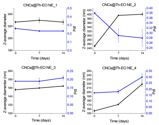 First, the four NEs showed a PdI below 0.4 and remained below 0.4 after storage, suggesting monodisperse oil droplet formation and good formulation homogeneity, consistent with agricultural applications [16]. The addition of CaCl2 improved colloidal stability just as observed in previous studies (paragraph 2.2.2). The formulations with CaCl2 (CNCs@Th-EO NE_1 and CNCs@Th-EO NE_3) showed no changes in DLS parameters over time, contrary to the others (CNCs@Th-EO NE_2 and CNCs@Th-EO NE_4). In particular, the CNCs@Th-EO NE_2 sample (10% v/v oil without CaCl2) showed a doubling of the Z-average diameter with a slight reduction in PdI after 7–14 days, indicating that a first coalescence phenomenon had already occurred after 7 days without flocculation or sedimentation. This behaviour is in line with what is suggested by the NE observation (creaming phenomenon) and the stability values in Table 3. Furthermore, the formulations with the lowest oil content (CNCs@Th-EO NE_3 and CNCs@Th-EO NE_4) formed smaller nanodroplets than the 10% v/v concentrated samples. This can be explained by the increased interfacial area of the droplets due to the higher oil concentration. As the number of CNCs was the same for all formulations, there was less cellulose available to stabilise the interfacial area. Consequently, an increase in EO concentration would result in less extensive coverage of the droplets’ surface by the available CNCs, leading to an increase in droplet volume with a consequent increase in Z-average diameter that reduces the total interfacial area. Huaping Yu et al. reported that the size of the clove oil droplets produced via homogenisation depended on the contribution of the stabiliser when a low number of CNCs was used [34]. These data are in line with our outcomes for the last NEs. The same trend was observed for cellulose-based EO MEs [33,35]. Finally, we can deduce that the crosslinking by Ca2+ compensates for the inefficient coverage of the droplet surface due to excess oil, thus increasing the stability of NEs without increasing the CNCs amount.