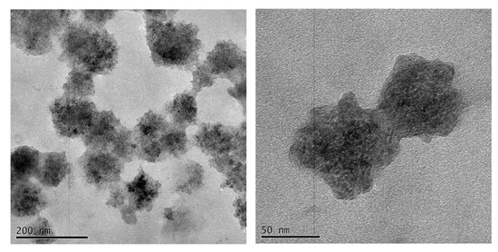 The morphology of CNCs@Th-EO NE_1 was characterised via TEM. First, TEM analysis revealed the formation of nanomicelles of 23.8 ± 4 nm deriving from surfactant molecule interaction with Th-EO (see Supplementary Figure S3). Supplementary Figure S3A,B show the presence of CNCs, such as a network in which nanomicelles were immersed. Figure 3 presents two representative TEM images of CNCs@Th-EO NE_1 nanodroplets.