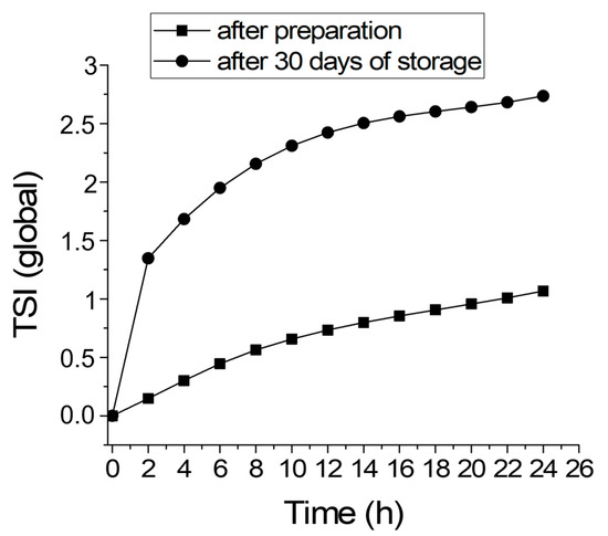 The higher encapsulation performance in the CNCs@Th-EO NE_1 formulation may be contributed by the excellent emulsifying properties of CNCs following the ionic crosslinking of Ca2+. Optical observation as well as DLS analysis demonstrated the physical–chemical stability of this NE. Emulsions stabilised by solid colloidal nanoparticles, referred to as Pickering emulsions, were generally characterised by long-term stability [32]; we verified this issue via Turbiscan LabExpert analysis during the first 24 h after NE preparation (following o.n. solvent evaporation) and after 30 days of storage at RT. These measurements were effectuated on native samples without any dilution. The instrument software (Turbiscan Easy Soft) calculates the TSI value (see Equation (4)) that is used to predict dispersion stability [65]; the smaller TSI value corresponds to a more stable system. In this study, TSI variation over 24 h of analysis was monitored, comparing the CNCs@Th-EO NE_1 immediately after preparation and after 30 days. TSI plots are presented in Figure 4.