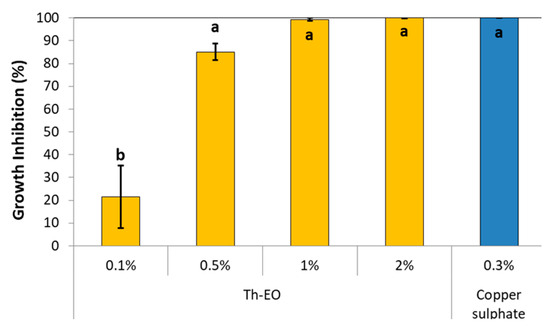 Antimicrobial properties of Th-EO on Psav when incorporated in agarised media. Data are represented as the mean and SD; different letters (a, b) show significantly different values after one-way ANOVA followed by Tukey’s HSD post hoc test were performed.