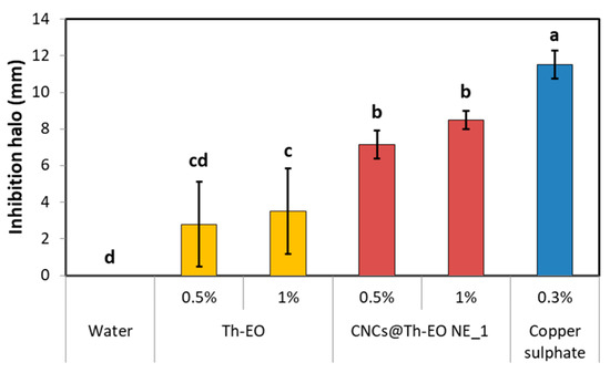 Inhibition halos produced by Th-EO and CNCs@Th-EO NE_1 in the disc diffusion test. Data are represented as the mean and SD; different letters (a, b, c, d) show significantly different values after one-way ANOVA followed by Tukey’s HSD post hoc test were performed.