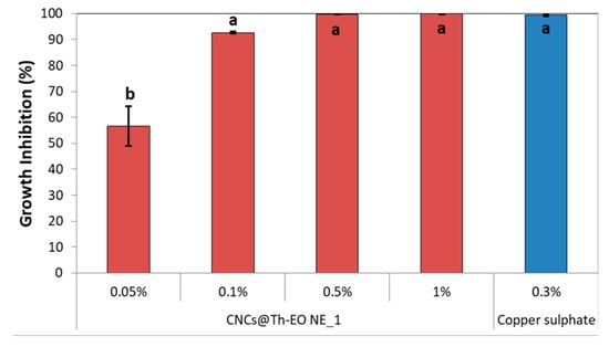 Growth inhibition percentages displayed by increasing doses of CNCs@Th-EO NE_1 on Psav using a microdilution assay. Data are represented as the mean and SD; different letters (a, b) show significantly different values after one-way ANOVA followed by Tukey’s HSD post hoc test were performed.