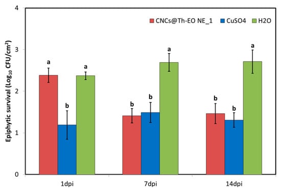 Epiphytic survival of Psav inoculated on olive seedlings after being treated with 0.5% v/v CNCs@Th-EO NE_1, 0.3% w/v copper sulphate, and water. Data are represented as the mean and SD; different letters (a, b) show significantly different values after one-way ANOVA followed by Tukey’s HSD post hoc test were performed.