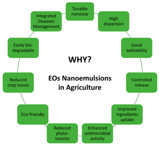 The application of nanotechnology leads to important innovations in products, including EO formulations, refining their physicochemical properties and functions [9,10,11,12]. EOs need to be encapsulated in emulsion form to be dispersible in water and to improve stability and bioavailability. Colloidal stability is also required to avoid gravity-related problems such as creaming or sedimentation. Nanoemulsions (NEs) offer improved wettability, improved diffusion capacity, and superior mechanical/chemical stability through the formation of nanometric droplets. These properties also reduce volatilisation and degradation of active ingredients, increasing target site penetration and bioactivity [13]. NE formulations are crucial for the water dispersion of lipophilic and/or poorly water-soluble compounds such as EOs, pesticides, or foodstuffs [14,15,16]. The following Scheme 1 presents the potential features of EO NEs for agricultural application.